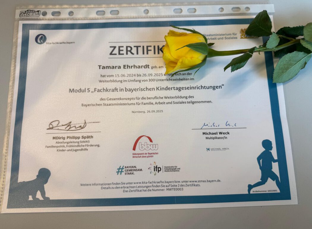 Wir gratulieren Tamara zu ihrer Weiterbildung als „Fachkraft in bayerischen Kindertageseinrichtungen“.