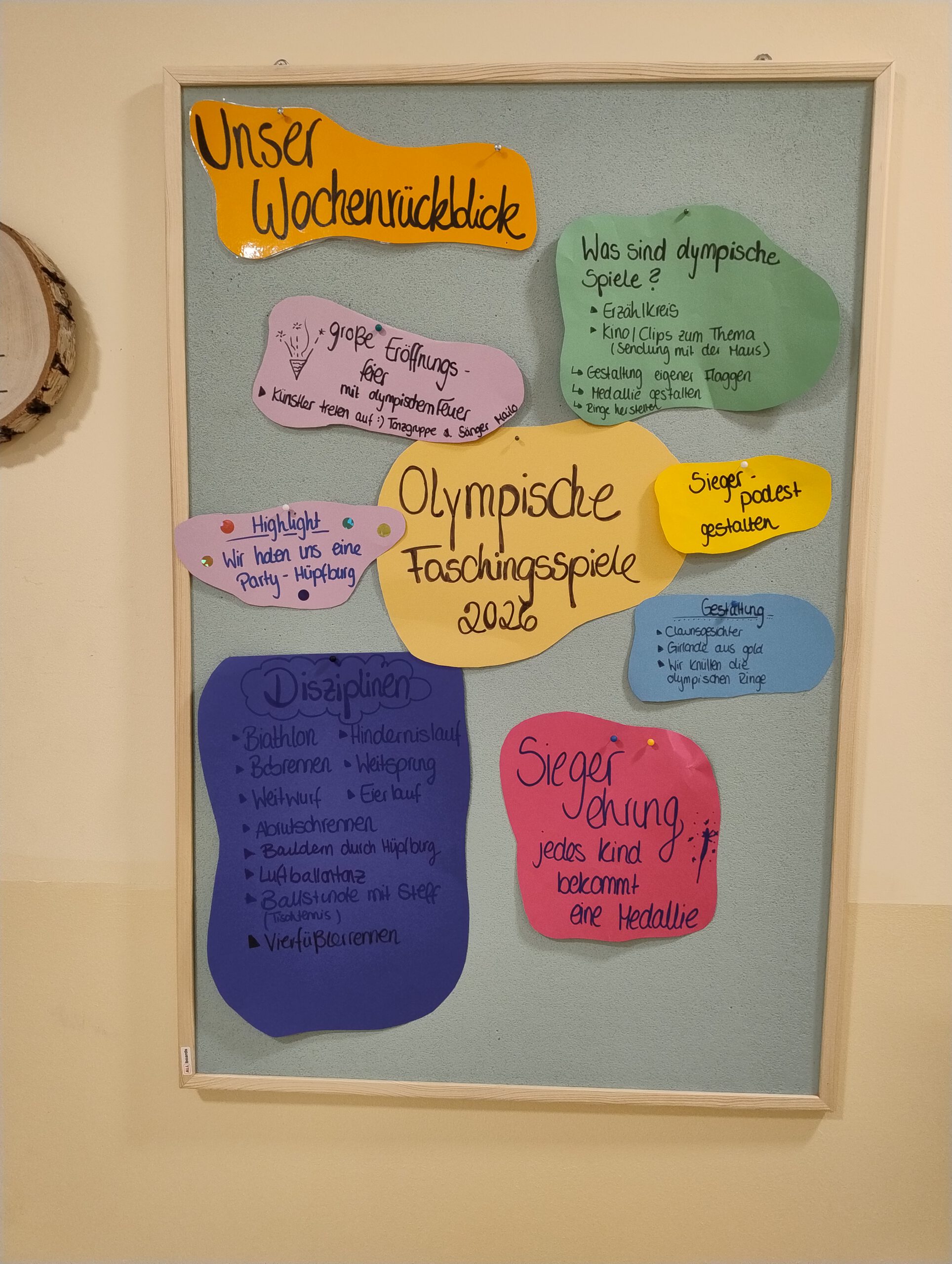 In der Kinderkonferenz haben die Strolche beschlossen, passend zum Fasching ihre eigenen Olympischen Spiele 2026 zu feiern. Nach einer spannenden Forschungsreise zum Hintergrund der Spiele wurden bereits ein eigenes Siegerpodest gebaut und kreative Disziplinen erfunden. Die Vorfreude auf die große Eröffnungsfeier mit Showeinlagen und olympischem Feuer war riesig! Zum krönenden Abschluss der Wettkämpfe wartete eine feierliche Siegerehrung, bei der alle Kinder eine Medaille für ihren Einsatz erhielten.